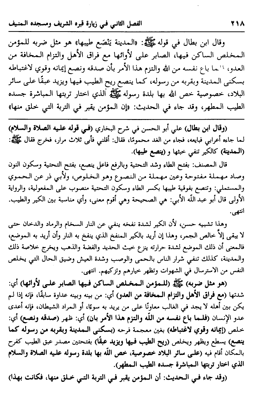 وقال ابن بطال في قوله -صلى الله عليه وسلم: "المدينة يَنْصَع طيبها" , هو مثل ضربه للمؤمن المخلص الساكن فيها، الصابر على لأوائها مع فراق الأهل, والتزام المخافة من العدو، فلمَّا باع نفسه من الله, والتزم هذا الأمر بأن صدقه, ونصع إيمانه وقوي لاغتباطه بسكنى المدينة, وبقربه من رسوله، كما ينصع ريح الطيب فيها ويزيد عبقًا على سائر البلاد، خصوصية خصَّ الله بها بلدة رسول الله -صلى الله عليه وسلم- الذي اختار تربتها المباشرة جسده الطيب المطهّر، وقد جاء في الحديث: "إن المؤمن يقبر في التربة التي خلق منها".