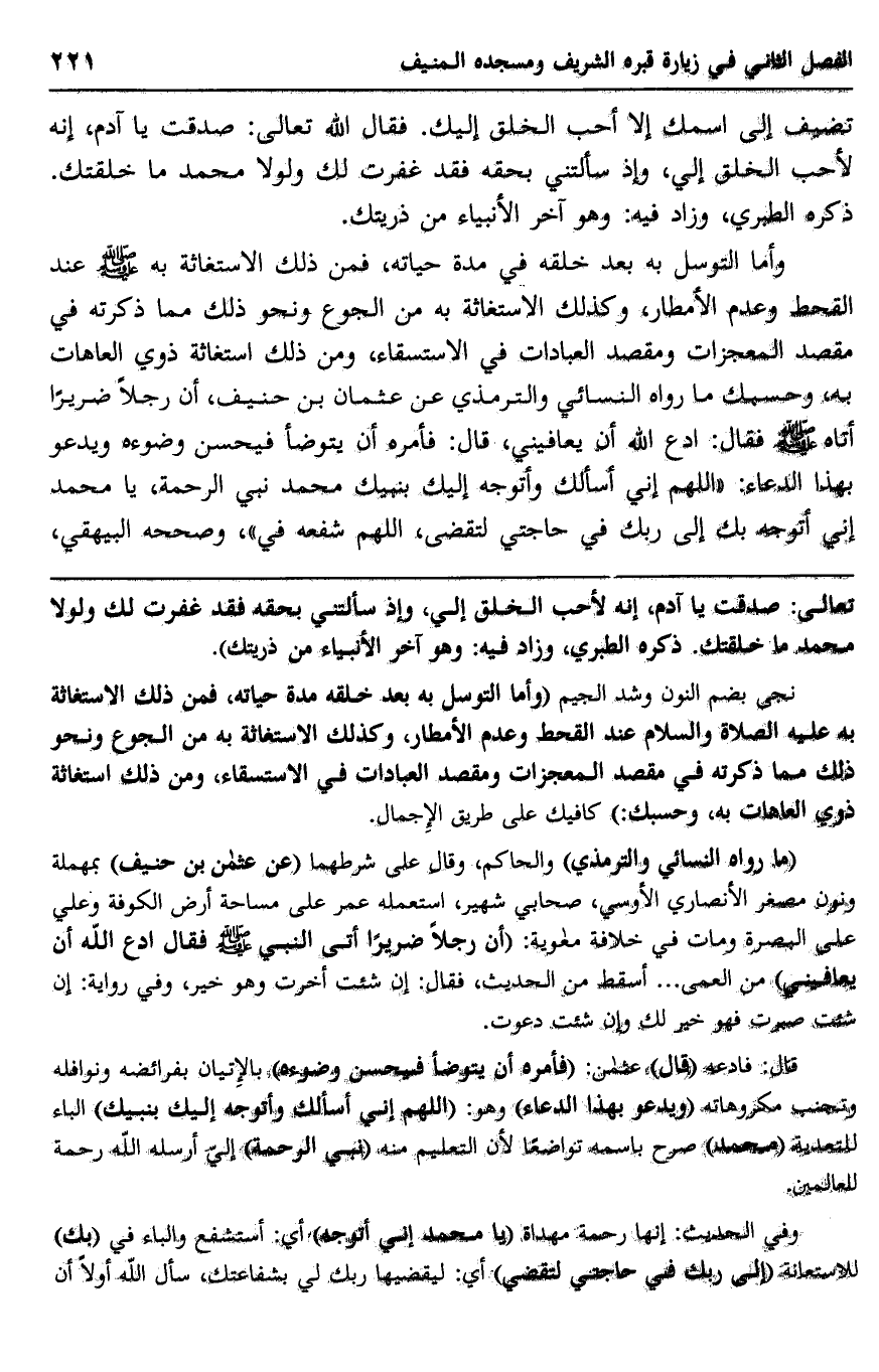 نجي -بضم النون وشد الجيم, "وأمَّا التوسل به بعد خلقه مدة حياته، فمن ذلك الاستغاثة به -عليه الصلاة والسلام- عند القحط وعدم الأمطار، وكذلك الاستغاثة به من الجوع, ونحو ذلك مما ذكرته في مقصد المعجزات ومقصد العبادات في الاستسقاء، ومن ذلك: استغاثة ذوي العاهات به، وحسبك:" كافيك على طريق الإجمال.