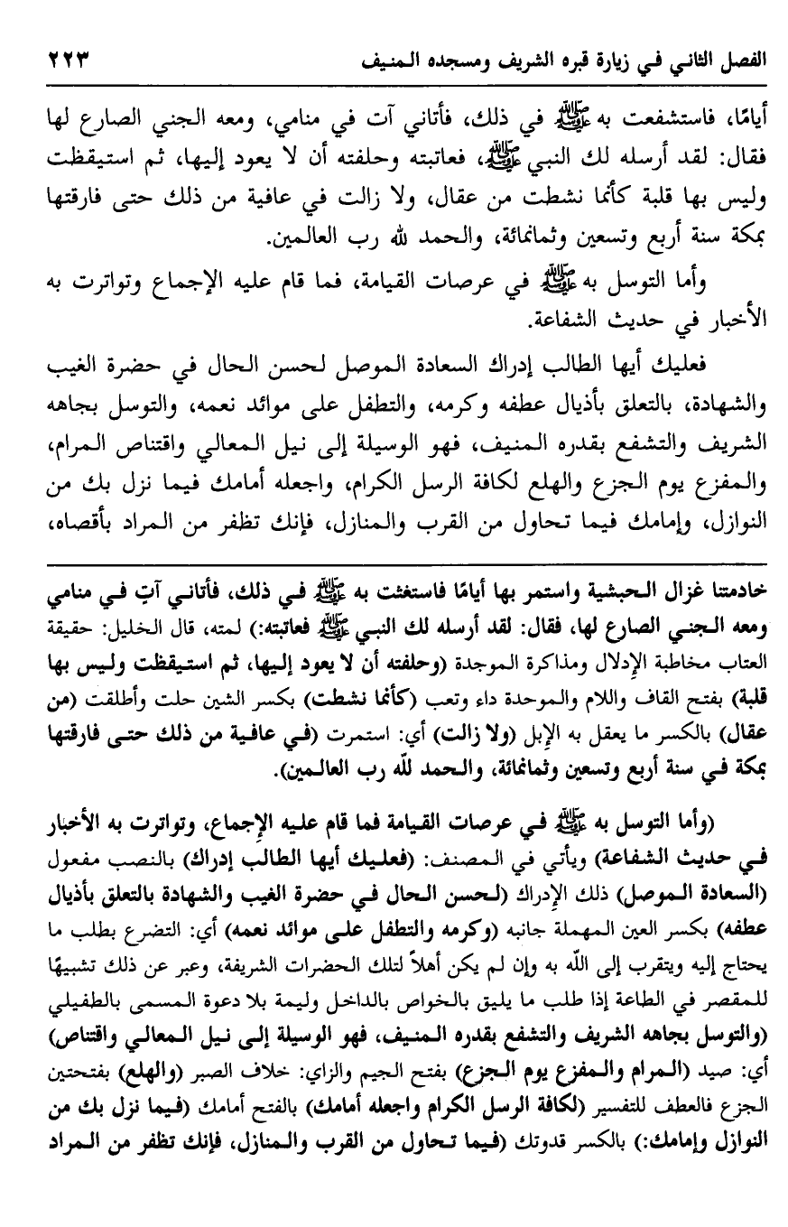 فعليك أيها الطالب إدراك السعادة الموصّل لحسن الحال في حضرة الغيب والشهادة, بالتعلق بأذيال عطفه وكرمه، والتطفل على موائد نعمه، والتوسُّل بجاهه الشريف, والتشفُّع بقدره المنيف، فهو الوسيلة إلى نيل المعالي واقتناص المرام، والمفزع يوم الجزع والهلع لكافة الرسل الكرام، واجعله أمامك فيما نزل بك من النوازل، وإمامك فيما تحاول من القرب والمنازل، فإنك تظفر من المراد بأقصاه،