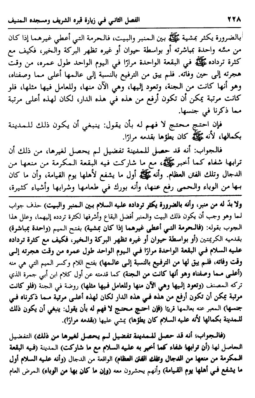 بالضرورة يكثر بمشيئة -صلى الله عليه وسلم- بين المنبر والبيت، فالحرمة التي أعطي غيرهما إذا كان من مسّه واحدة بمباشرته, أو بواسطة حيوان أو غيره تظهر البركة والخير، فكيف مع كثرة ترداده -صلى الله عليه وسلم- في البقعة الواحدة مرارًا في اليوم الواحد طول عمره، من وقت هجرته إلى حين وفاته. فلم يبق من الترفيع بالنسبة إلى عالمها أعلى مما وصفناه، وهو أنَّها كانت من الجنة، وتعود إليها، وهي الآن منها. وللعامل فيها مثلها، فلو كانت مرتبة يمكن أن تكون أرفع من هذه في هذه الدار، لكان لهذه أعلى مرتبة مما ذكرناه في جنسها.