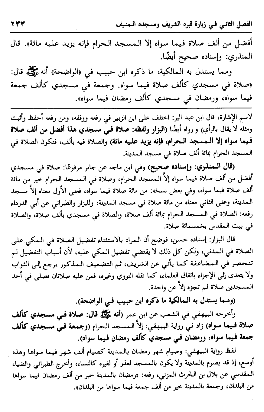 لاسم الإشارة، قال ابن عبد البر: اختلف على ابن الزبير في رفعه ووقفه، ومن رفعه أحفظ وأثبت, ومثله لا يقال بالرأي", ورواه أيضًا "البزار ولفظه: "صلاة في مسجدى هذا أفضل من ألف صلاة فيما سواه, إلا المسجد الحرام، فإنه يزيد عليه مائة" والصلاة فيه بألف، فتكون الصلاة في المسجد الحرام بمائة ألف صلاة في مسجد المدينة.