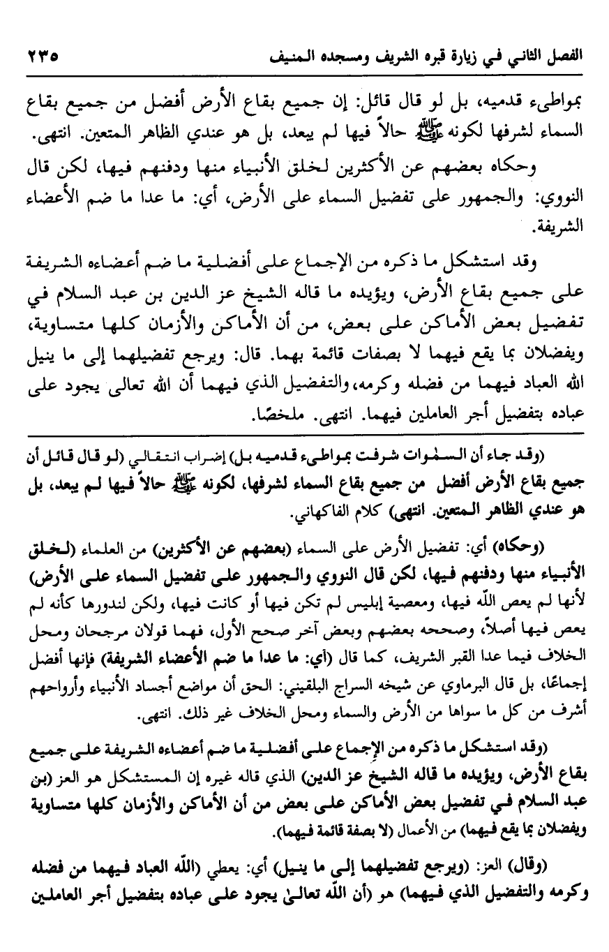 وقد استشكل ما ذكره من الإجماع على أفضلية ما ضمّ أعضاءه الشريفة على جميع بقاع الأرض، ويؤيده ما قاله الشيخ عز الدين بن عبد السلام في تفضيل بعض الأماكن على بعض، من أنَّ الأماكن والأزمان كلها متساوية، ويفضلان بما يقع فيهما, لا بصفات قائمة بهما. قال: ويرجع تفضيلهما إلى ما ينيل الله العباد فيهما من فضله وكرمه، والتفضيل الذي فيهما أنَّ الله تعالى يجود على عباده بتفضيل أجر العاملين فيهما. انتهى ملخصًا.