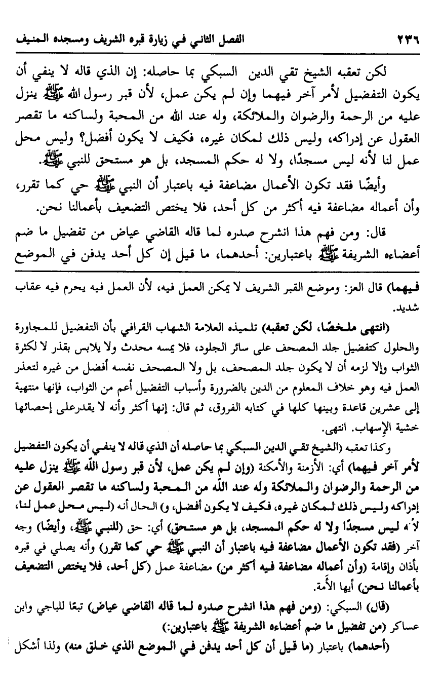 "انتهى ملخصًا، لكن تعقبه" تلميذه العلامة الشهاب القرافي, بأنَّ التفضيل للمجاورة والحلول كتفضيل جلد المصحف على سائر الجلود، فلا يمسه محدث, ولا يلابس بقذر, لا لكثرة الثواب, وإلا لزمه أن لا يكون جلد المصحف، بل ولا المصحف نفسه أفضل من غيره؛ لتعذر العمل فيه, وهو خلاف المعلوم من الدين بالضرورة, وأسباب التفضيل أعمّ من الثواب، فإنها منتهية إلى عشرين قاعدة, وبيِّنَها كلها في كتابه الفروق، ثم قال: إنها أكثر, وأنه لا يقدر على إحصائها خشية الإسهاب. انتهى.