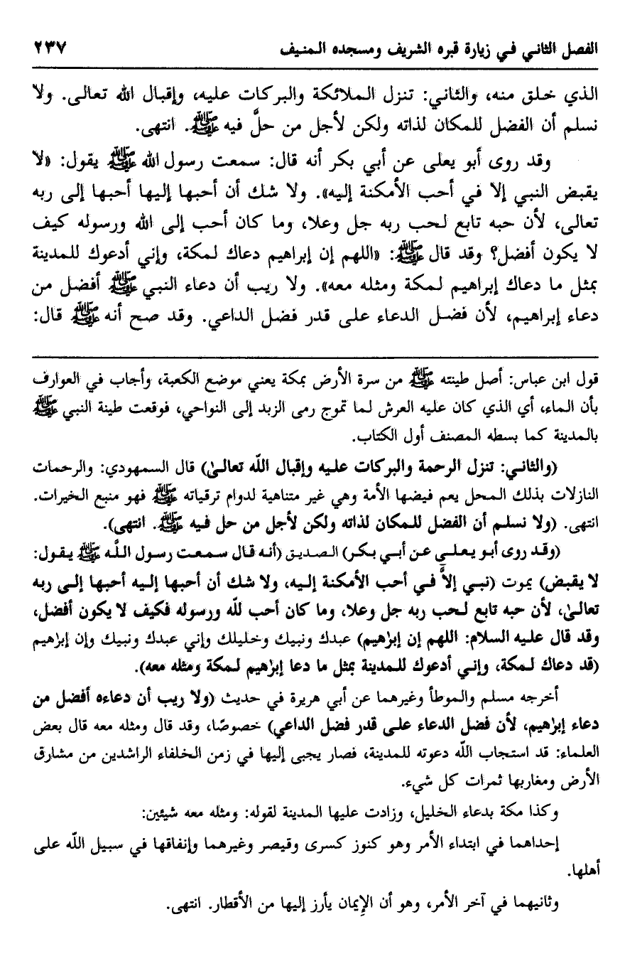 "وقد روى أبو يعلى عن أبي بكر" الصديق, "أنه قال: سمعت رسول الله -صلى الله عليه وسلم- يقول: "لا يقبض" يموت "ني, إلّا في أحبِّ الأمكنة إليه"، ولا شكَّ أن أحبها إليه أحبها إلى ربه تعالى؛ لأن حبه تابع لحب ربه -جلَّ وعلا، وما كان أحب لله ورسوله فكيف لا يكون أفضل، وقد قال عليه السلام: "اللهم إن إبراهيم" عبدك ونبيك وخليلك, وإني عبدك ونبيك, وإن إبراهيم "قد دعاك لمكة، وإني أدعوك للمدينة بمثل ما دعا إبراهيم لمكة ومثله معه".