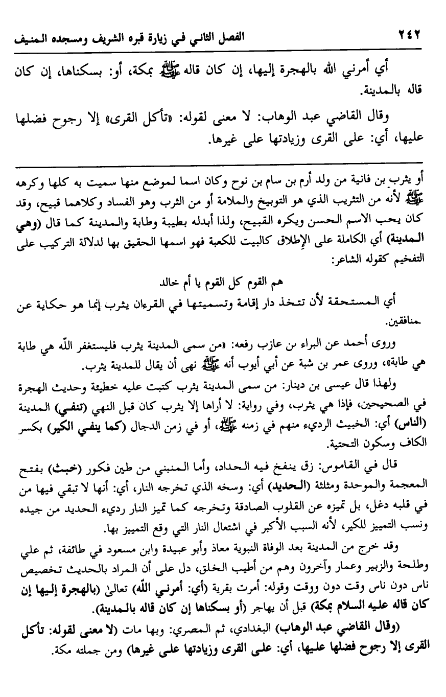 "وقال القاضي عبد الوهاب" البغدادي، ثم المصري: وبها مات "لا معنى لقوله: "تأكل القرى" إلّا رجوح فضلها عليها، أي: على القرى, وزيادتها على غيرها", ومن جملته مكة.