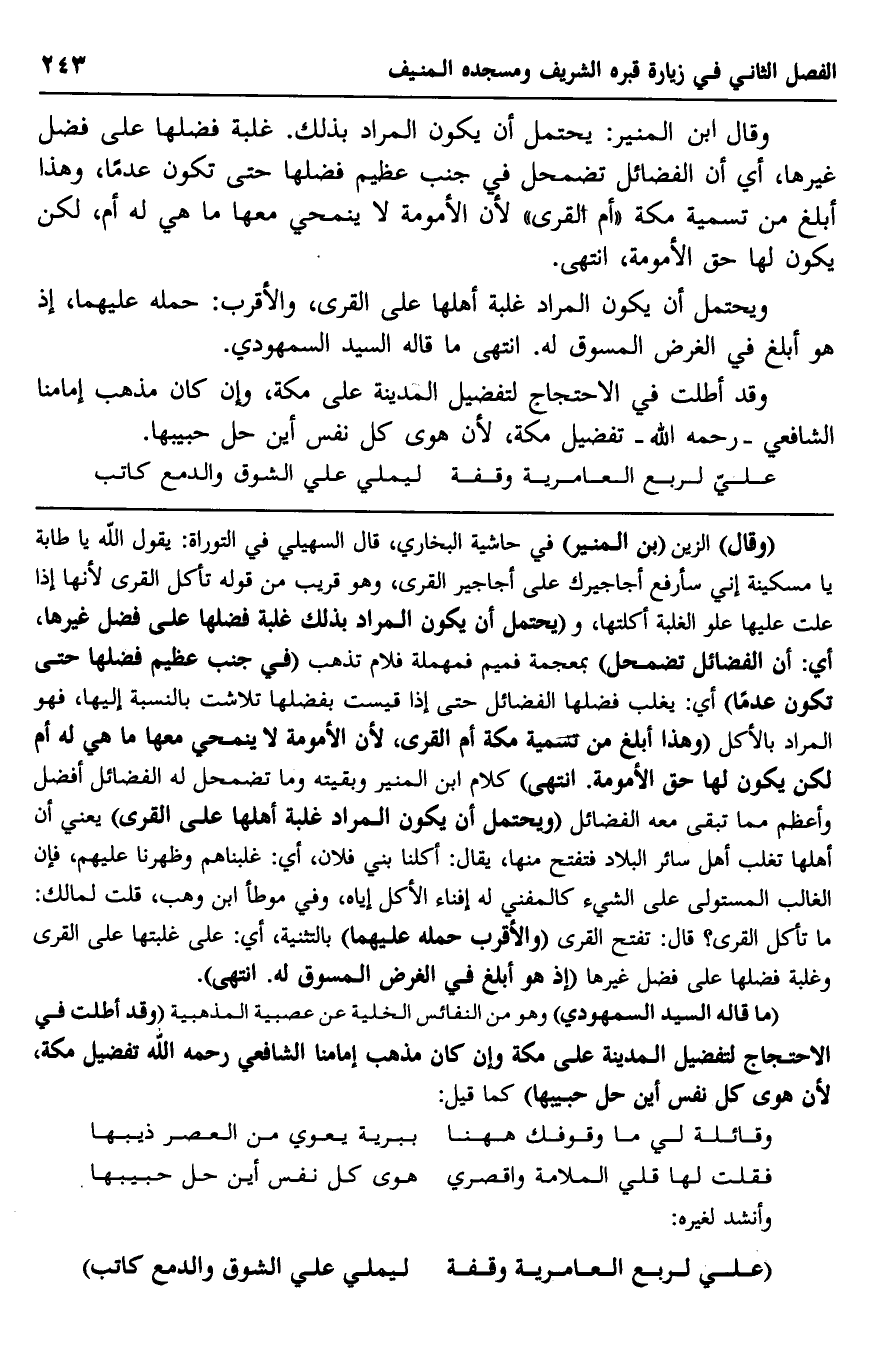 "ما قاله السيد السمهودي" وهو من النفائس الخلية عن عصبية المذهبية, "وقد أطلت في الاحتجاج لتفضيل المدينة على مكة, وإن كان مذهب إمامنا الشافعي -رحمه الله- تفضيل مكة؛ لأن هوى كل نفس أين حلَّ حبيبها" كما قيل: