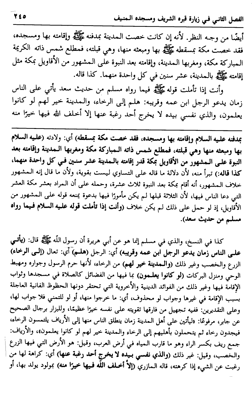 بمدفنه -عليه السلام- وإقامته بها ومسجده، فقد خُصَّت مكة بمسقطه" أي: ولادته "عليه السلام- بها, ومبعثه منها, وهي قبلته، فمطلع شمس ذاته المباركة مكة, ومغربها المدينة, وإقامته بعد النبوة على المشهور من الأقاويل بمكة, قدر إقامته بالمدينة, عشر سنين في كل واحدة منهما, كذا قاله" تبرأ منه؛ لأنَّ دلالة ما قاله على التساوي ليست بقوية؛ ولأن ما قال: إنه المشهور خلاف المشهور، أنه أقام بمكة بعد النبوة ثلاث عشرة، وحمه على أنَّ المراد بعشر مكة العشر التي دعا الناس فيها؛ لأن الثلاثة قبلها لم يكن مأمورًا فيها بدعوة, يمنعه قوله على المشهور من الأقاويل؛ إذ لو حمل على ذلك لم يكن خلاف, "وأنت إذا تأمَّلت قوله -عليه السلام- فيما رواه مسلم من حديث سعد".