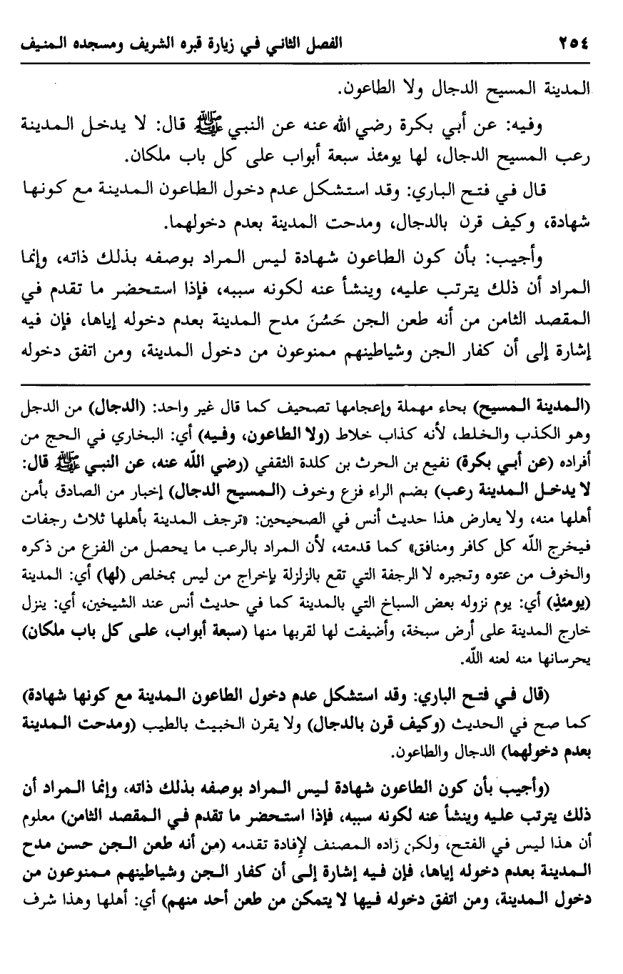 "قال في فتح الباري: "وقد استشكل عدم دخول الطاعون المدينة مع كونها شهادة" كما صحَّ في الحديث, "وكيف قرن بالدجال" ولا يقرن الخبيث بالطيب, "ومدحت المدينة بعدم دخولهما" الدجال والطاعون.