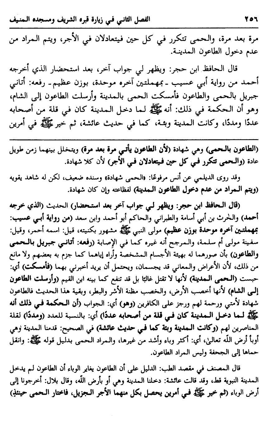 قال المصنف في مقصد الطب الدليل على أنَّ الطاعون يغاير الوباء, أنَّ الطاعون لم يدخل المدينة النبوية قط، وقد قالت عائشة: دخلنا المدينة وهي أوبأ أرض الله، وقال بلال: أخرجونا إلى أرض الوباء, "ثم خُيِّر -صلى الله عليه وسلم- في أمرين يحصل بكلٍّ منهما الأجر الجزيل، فاختار الحمَّى حينئذ"