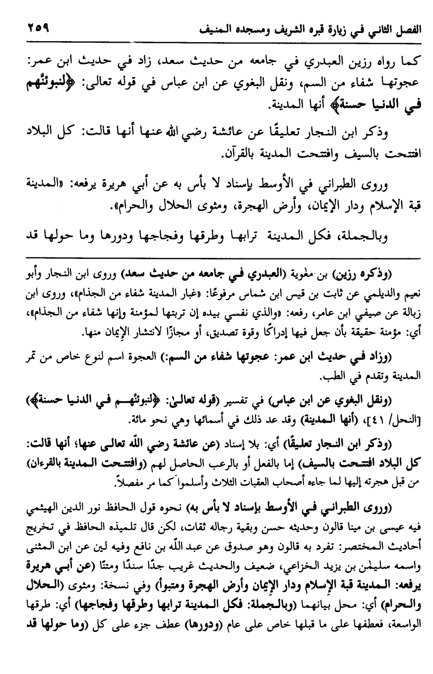 كما رواه رزين العبدري في جامعه من حديث سعد، زاد في حديث ابن عمر: عجوتها شفاء من السم، ونقل البغوي عن ابن عباس في قوله تعالى: {لَنُبَوِّئَنَّهُمْ فِي الدُّنْيَا حَسَنَةً} أنها المدينة.