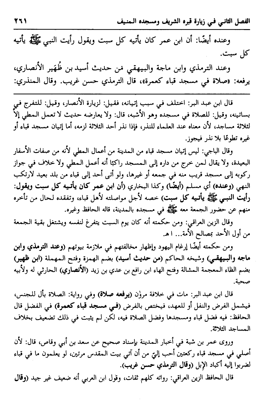 وعند الترمذي وابن ماجه والبيهقي في حديث أسيد بن ظهير الأنصاري، يرفعه: "صلاة في مسجد قباء كعمرة" , قال الترمذي: حسن غريب. وقال المنذري: