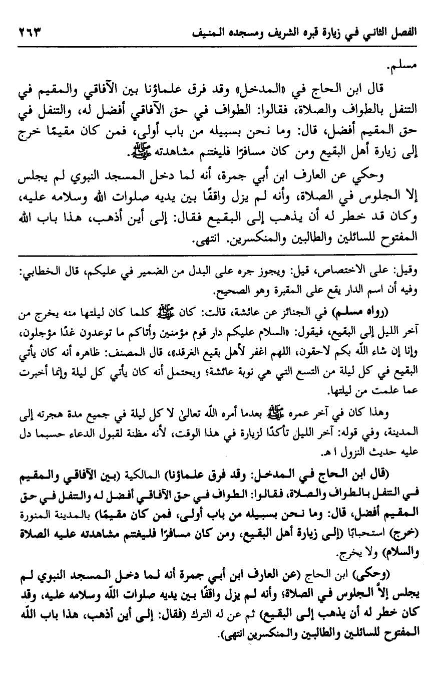 "قال ابن الحاج في المدخل: وقد فرق علماؤنا" المالكية "بين الآفاقي والمقيم في التنفل بالطواف والصلاة فقالوا: الطواف في حق الآفاقي أفضل له, والتنفل في حق المقيم أفضل، قال: وما نحن بسبيله من باب أَوْلى، فمن كان مقيمًا" بالمدينة المنورة "خرج" استحبابًا "إلى زيارة أهل البقيع، ومن كان مسافرًا فليغتنم مشاهدته -عليه الصلاة والسلام" ولا يخرج.