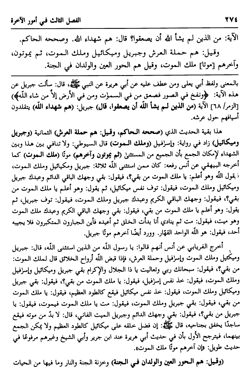 أخرج الفريابي عن أنس أنهم قالوا: يا رسول الله, من الذين استثنى الله، قال: "جبريل وميكائيل وملك الموت وإسرافيل وحملة العرش، فإذا قبض الله أرواح الخلائق قال لملك الموت: من بقي؟ فيقول: سبحانك ربي وتعاليت, يا ذا الجلال والإكرام, بقي جبريل وميكائيل وإسرافيل وملك الموت، فيقول: خذ نفس إسرافيل، فيقول: يا ملك الموت, من بقي؟ فيقول: بقي جبريل وميكائيل وملك الموت، فيقول: خذ نفس ميكائيل, فيقع كالطود العظيم، فيقول: يا ملك الموت, من بقي، فيقول: بقي وجهك الدائم وجبريل الميت الفاني، قال: لا بد من موته, فيقع ساجدًا يخفق بجناحيه"، قال -صلى الله عليه وسلم: "إن فضل خلقه على ميكائيل كالطود العظيم" ولا يمكن الجمع بينهما، فيترجّح الأول بأن في حديث أبي هريرة عند ابن جرير وأبي الشيخ وغيرهم مرفوعًا في حديث طويل: "إن آخرهم موتًا ملك الموت".