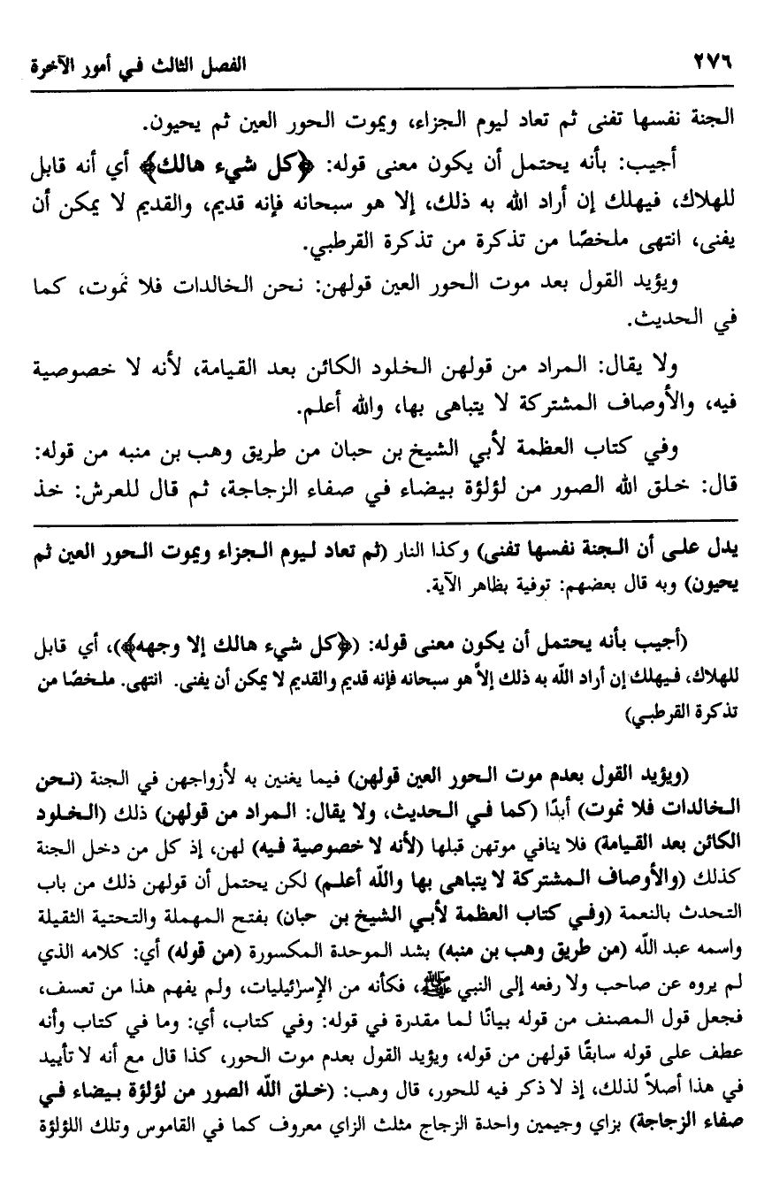 الجنة نفسها تفنى ثم تعاد ليوم الجزاء، ويموت الحور العين ثم يحيون.