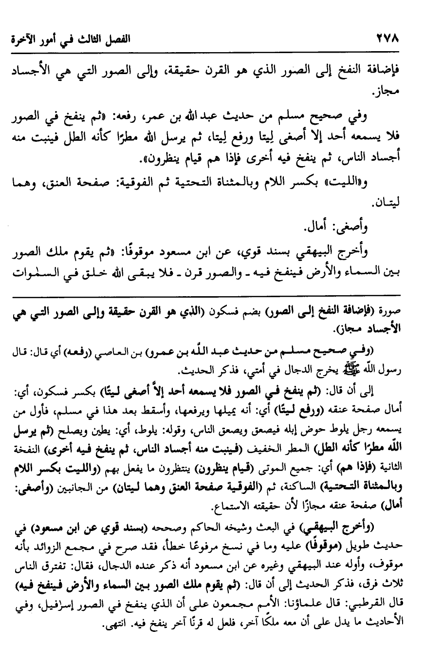 وفي صحيح مسلم من حديث عبد الله بن عمرو" بن العاص "رفعه" أي: قال: قال رسول الله -صلى الله عليه وسلم: "يخرج الدجال في أمتي" فذكر الحديث إلى أن قال: "ثم ينفخ في الصور لا يسمعه أحد إلّا أصغى ليتا" بكسر فسكون، أي: أمال صفحة عنقه, "ورفع ليتا" أي: أنه يميلها ويرفعها، وأسقط بعد هذا في مسلم: فأوّل من يسمعه رجل يلوط حوض إبله فيصعق ويصعق الناس، وقوله: يلوط، أي: يطين ويصلح ثم يرسل الله مطرًا كأنه الطل" المطر الخفيف, "فينبت منه أجساد الناس, ثم ينفخ فيه أخرى" النفخة الثانية, "فإذا هم" أي: جمع الموتى "قيام ينظرون" ينتظرون ما يفعل بهم, "والليت بكسر اللام وبالمثناة التحتية" الساكنة، ثم "الفوقية صفحة العنق وهما ليتان" من الجانبين, "وأصغى: أمال" صفحة عنقه مجازًا لأن حقيقته الاستماع.