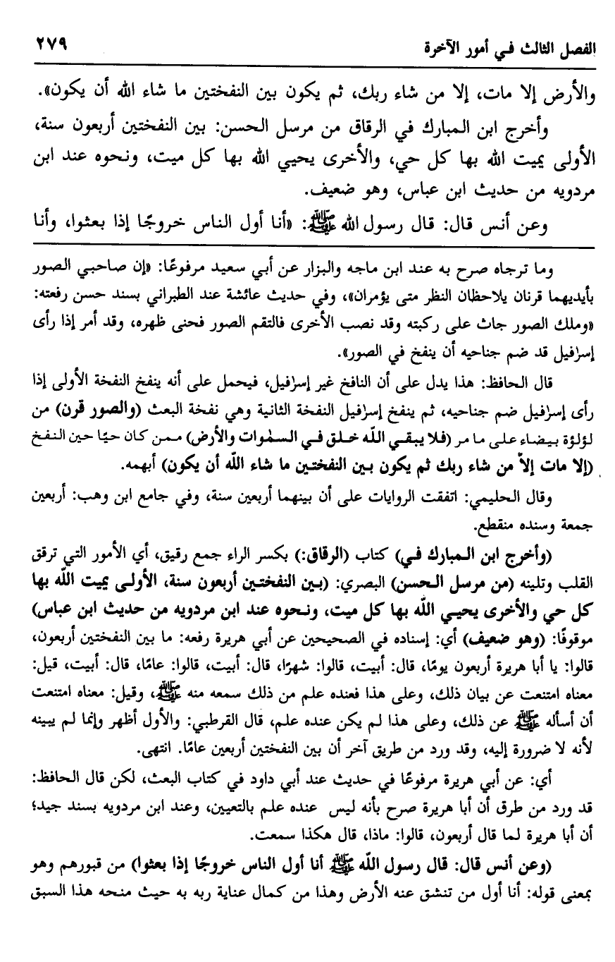 "وأخرج ابن المبارك في" كتاب "الرقاق" بكسر الراء- جمع رقيق, أي الأمور التي ترقق القلب وتلينه, من مرسل الحسن البصري: بين النفختين أربعون سنة، الأولى يميت الله بها كل حي, والأخرى يحيي الله بها كل ميت، ونحوه عند ابن مردويه من حديث ابن عباس" موقوفًا "وهو ضعيف" أي: إسناده في الصحيحين عن أبي هريرة رفعه: "ما بين النفختين أربعون"، قالوا: يا أبا هريرة أربعون يومًا، قال أبيت، قالوا: شهرًا قال: أبيت، قالوا: عامًا، قال: أبيت, قيل: معناه: امتنعت عن بيان ذلك، وعلى ذلك فعنده علم من ذلك سمعه منه -صلى الله عليه وسلم، وقيل: معناه: امتنعت أن أسأله -صلى الله عليه وسلم- عن ذلك, وعلى هذا لم يكن عنده علم, قال القرطبي: والأول أظهر, وإنما لم يبينه لأنه لا ضرورة إليه، وقد ورد من طريق آخر أن بين النفختين أربعين عامًا. انتهى.