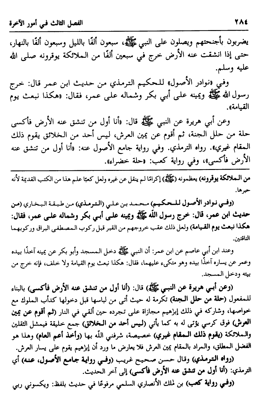 "وفي نوادر الأصول للحكيم" محمد بن علي "الترمذي" من طبقة البخاري, "من حديث ابن عمر" قال: خرج رسول الله -صلى الله عليه وسلم- ويمينه على أبي بكر, وشماله على عمر، فقال: "هكذا نبعث يوم القيامة" , ولعل ذلك عقب خروجهم من القبر, ركوب المصطفى البراق وركوبهما الناقتين.