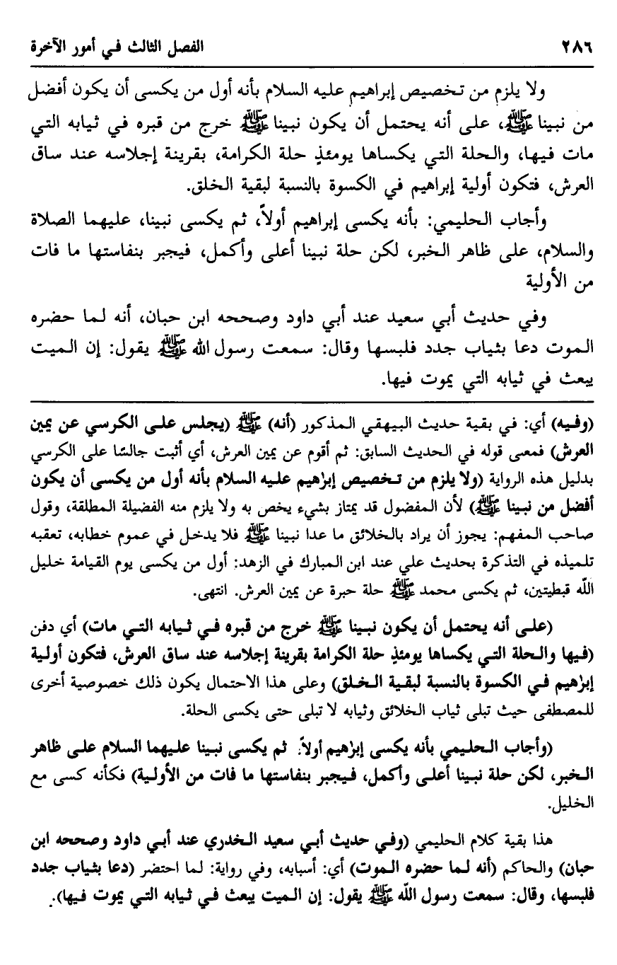 "على أنَّه يحتمل أن يكون نبينا -صلى الله عليه وسلم- خرج من قبره في ثيابه التي مات" أي: دفن "فيها, والحلة التي يكساها يومئذ حلة الكرامة, بقرينة إجلاسه عند ساق العرش، فتكون أولية إبراهيم في الكسوة بالنسبة لبقية الخلق", وعلى هذا الاحتمال يكون ذلك خصوية أخرى للمصطفى؛ حيث تبلى ثياب الخلائق وثيابه لا تبلى حتى يكسى الحلة.