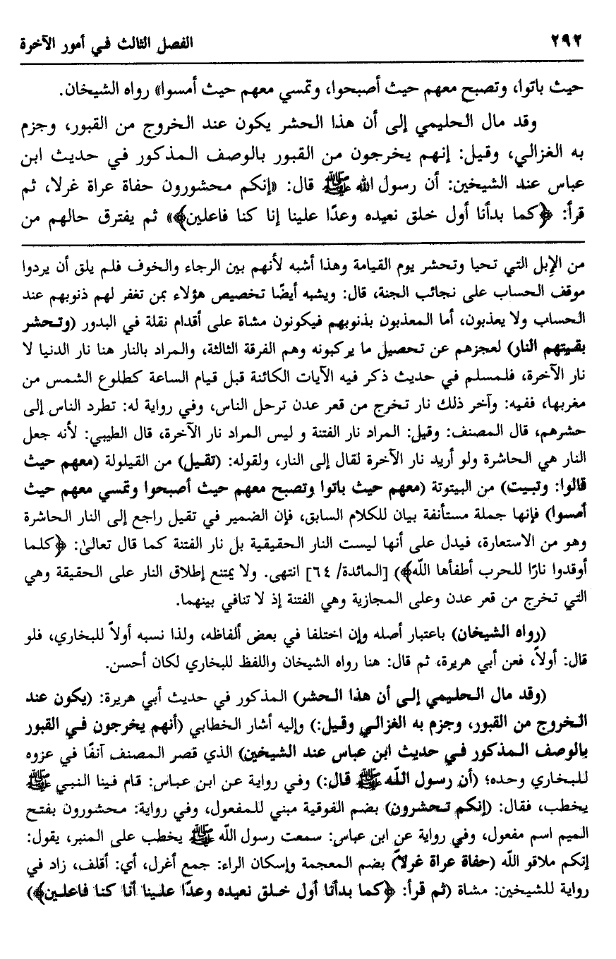 "وقد مال الحليمي إلى أنَّ هذا الحشر" المذكور في حديث أبي هريرة, "يكون عند الخروج من القبور، وجزم به الغزالي وقيل" وإليه أشار الخطابي, "أنهم يخرجون في القبور بالوصف المذكور في حديث ابن عباس عند الشيخين" الذي قصر المصنف آنفًا في عزوه للبخاري وحده، "أنَّ رسول الله -صلى الله عليه وسلم- قال" وفي رواية عن ابن عباس: قام فينا النبي -صلى الله عليه وسلم- يخطب، فقال: "إنكم تحشرون" بضم الفوقية- مبني للمفعول، وفي رواية: محشورون -بفتح الميم- اسم مفعول، وفي رواية عن ابن عباس: سمعت رسول الله -صلى الله عليه وسلم- يخطب على المنبر، يقول: "إنكم ملاقو الله حفاة عراة غرلًا" بضم المعجمة وإسكان الراء- جمع أغرل، أي: أقلف، زاد في رواية للشيخين: مشاة, "ثم قرأ: {كَمَا بَدَأْنَا أَوَّلَ خَلْقٍ نُعِيدُهُ وَعْدًا عَلَيْنَا إِنَّا كُنَّا فَاعِلِينَ} .