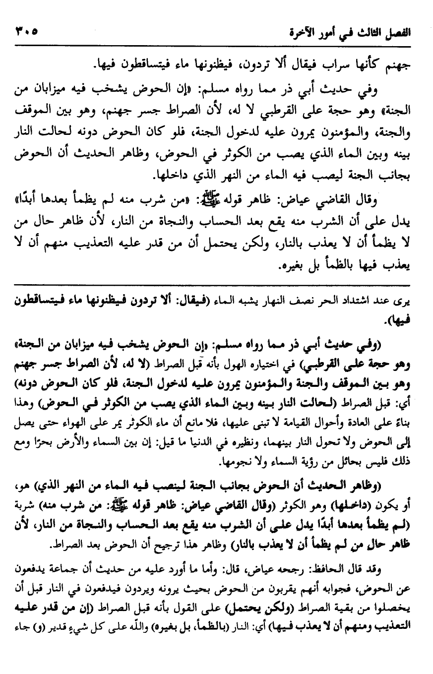 وفي حديث أبي ذر مما رواه مسلم: "إن الحوض يشخب فيه ميزابان من الجنة" , وهو حجة على القرطبي لا له؛ لأن الصراط جسر جهنم، وهو بين الموقف والجنة, والمؤمنون يمرون عليه لدخول الجنة، فلو كان الحوض دونه لحالت النار بينه وبين الماء الذي يصب من الكوثر في الحوض، وظاهر الحديث أن الحوض بجانب الجنة؛ ليصب فيه الماء من النهر الذي داخلها.