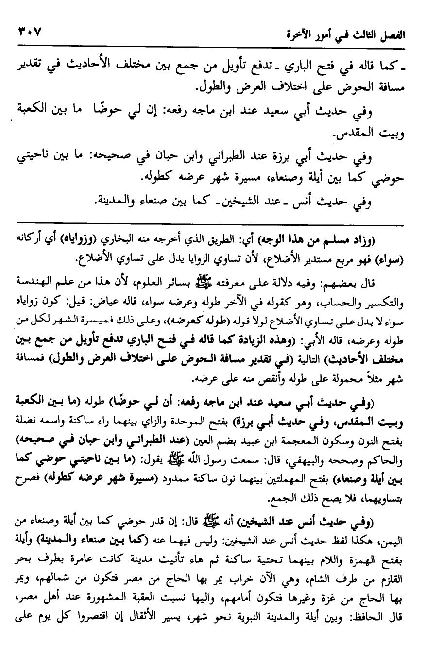 "وفي حديث أنس عند الشيخين" أنه -صلى الله عليه وسلم- قال: "إن قدر حوضي كما بين أيلة وصنعاء من اليمن"، هكذا لفظ حديث أنس عند الشيخين: وليس فيهما عنه "كما بين صنعاء والمدينة" وأيلة -بفتح الهمزة واللام بينهما تحتية ساكنة ثم هاء تانيث- مدينة كانت عامرة بطرف بحر القلزم من طرف الشام، وهي الآن خراب يمر بها الحاج من مصر, فتكون من شمالهم, ويمر بها الحاج من غزة وغيرها فتكون أمامهم، وإليها نسبت العقبة المشهورة عند أهل مصر، قال الحافظ: وبين أيلة والمدينة النبوية نحو شهر، يسير الأثقال إن اقتصروا كل يوم على
