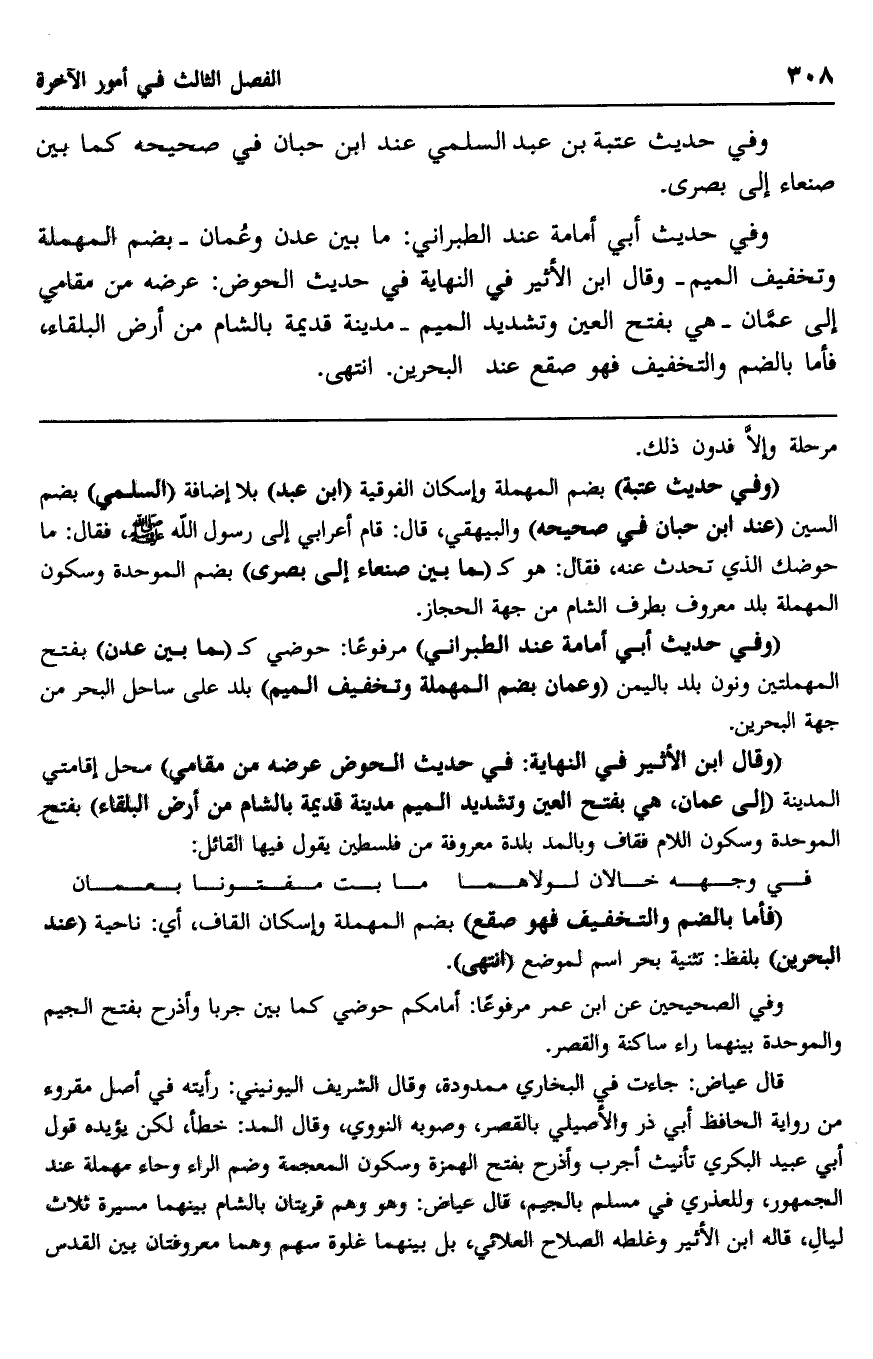 "وقال ابن الأثير في النهاية في حديث الحوض: عرضه من مقامي" محل إقامتي المدينة "إلى عمان، هي بفتح العين وتشديد الميم- مدينة قديمة بالشام من أرض البلقاء" بفتح الموحدة وسكون اللام فقاف وبالمد- بلدة معروفة من فلسطين, يقول فيها القائل: