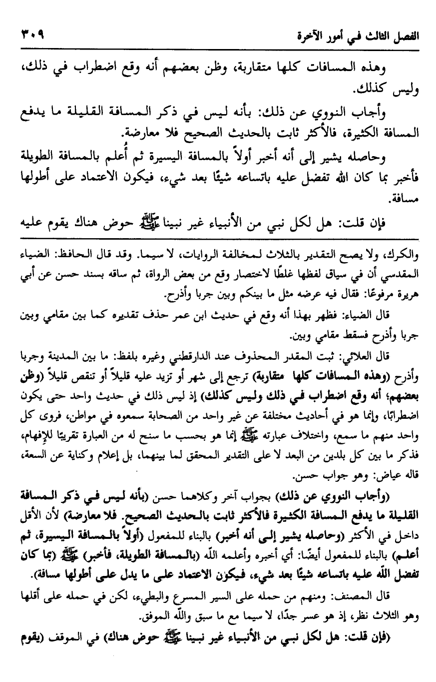 قال العلائي: ثبت المقدر المحذوف عند الدارقطني وغيره بلفظ: ما بين المدينة وجربا وأذرح "وهذه المسافات كلها متقاربة" ترجع إلى شهر أو تزيد عليه قليلًا أو تنقص قليلًا, "وظن بعضهم أنه وقع اضطراب في ذلك, وليس كذلك"؛ إذ ليس ذلك في حديث واحد حتى يكون اضطرابًا، وإنما هو في أحاديث مختلفة عن غير واحد، من الصحابة سمعوه في مواطن، فروى كل واحد منهم ما سمع, واختلاف عبارته -صلى الله عليه وسلم- إنما هو بحسب ما سنح له من العبارة تقريبًا للإفهام، فذكر ما بين كل بلدين من البعد لا على التقدير المحقق لما بينهما بل إعلام وكناية عن السعة، قاله عياض: وهو جواب حسن.