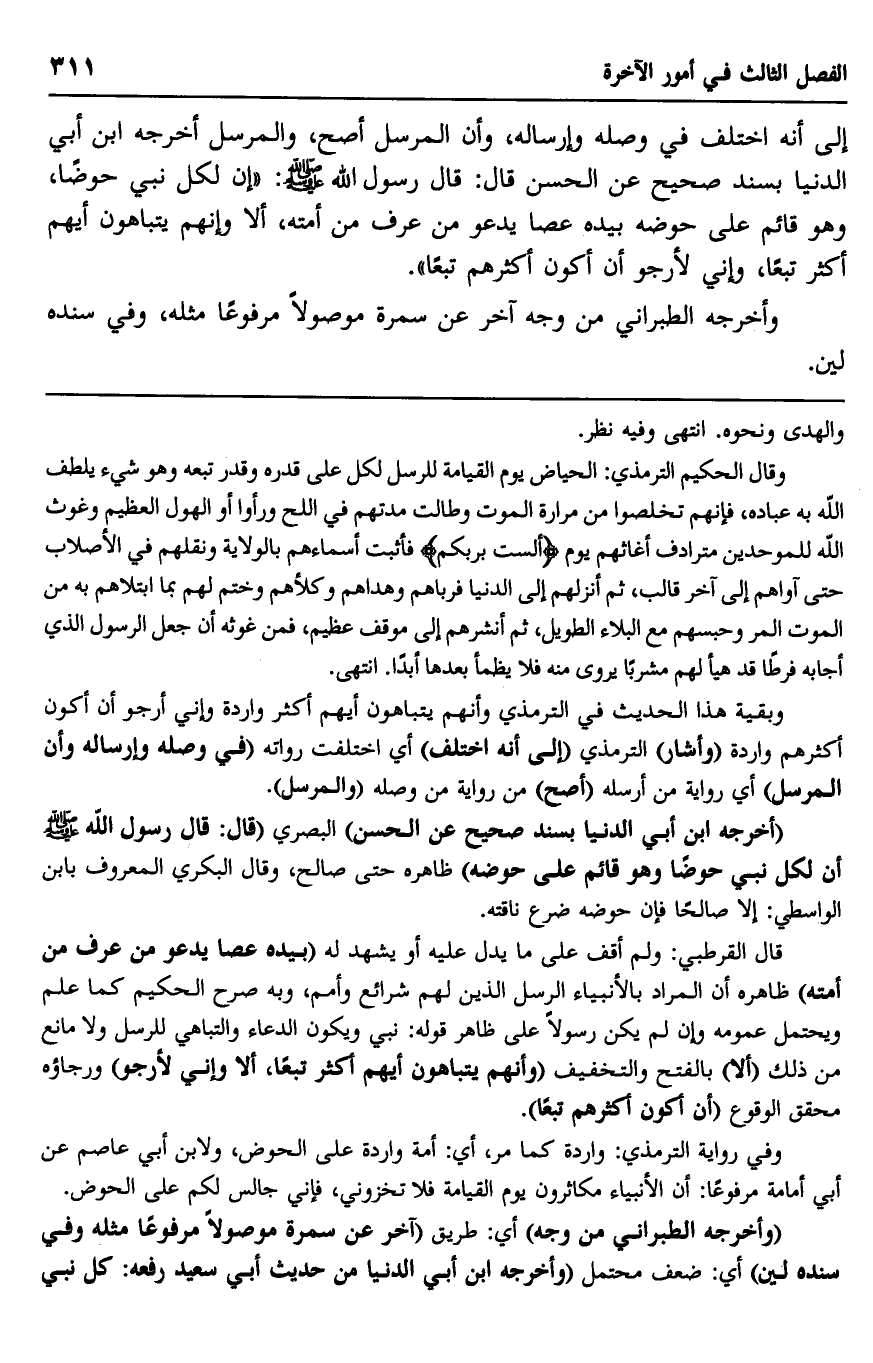 إلى أنه اختلف في وصله وإرساله، وأنَّ المرسل أصح، والمرسل أخرجه ابن أبي الدنيا بسند صحيح عن الحسن قال: قال رسول الله -صلى الله عليه وسلم: "إن لكل نبي حوضًا، وهو قائم على حوضه بيده عصًا, يدعو من عرف من أمته، ألّا وإنهم يتباهون أيهم أكثر تبعًا، وإني لأرجو أن أكون أكثرهم تبعًا".