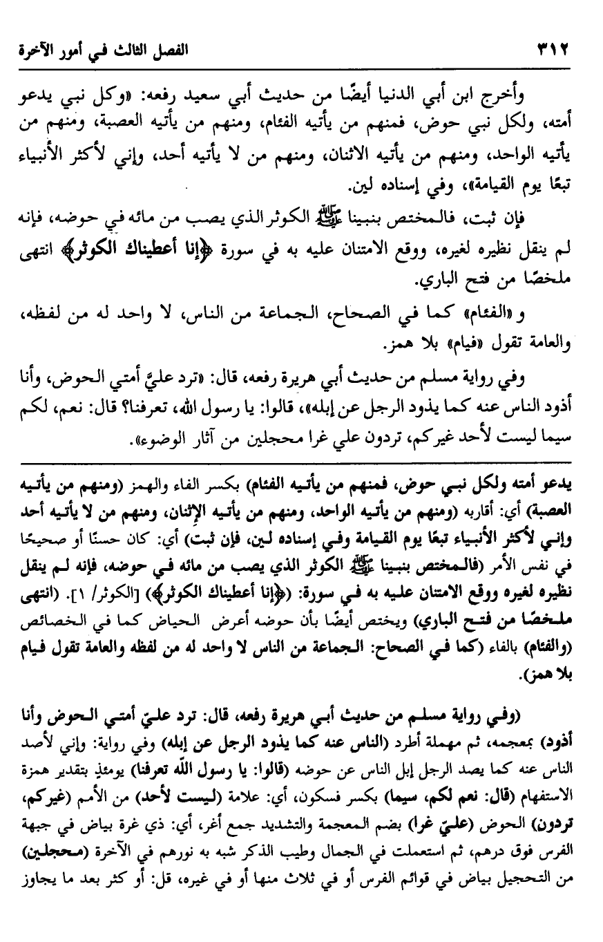 يدعو أمته, ولكل نبي حوض، فمنهم من يأتيه الفئام" بكسر الفاء والهمز, "ومنهم من يأتيه العصبة" أي أقاربه, "ومنهم من يأتيه الواحد، ومنهم من يأتيه الاثنان، ومنهم من لا يأتيه أحد, وإني لأكثر الأنبياء تبعًا يوم القيامة" وفي إسناده لين، فإن ثبت" أي: كان حسنًا أو صحيحًا في نفس الأمر, فالمختص بنبينا -صلى الله عليه وسلم- الكوثر الذي يصب من مائه في حوضه، فإنه لم ينقل نظيره لغيره, ووقع الامتنان عليه به في سورة {إِنَّا أَعْطَيْنَاكَ الْكَوْثَر} [الكوثر: 1] انتهى لخصًا من فتح الباري", ويختص أيضًا بأنَّ حوضه أعرض الحياض كما في الخصائص, والفئام بالفاء كما في الصحاح: الجماعة من الناس, لا واحد له من لفظه, والعامة تقول: فيام -بلا همز".