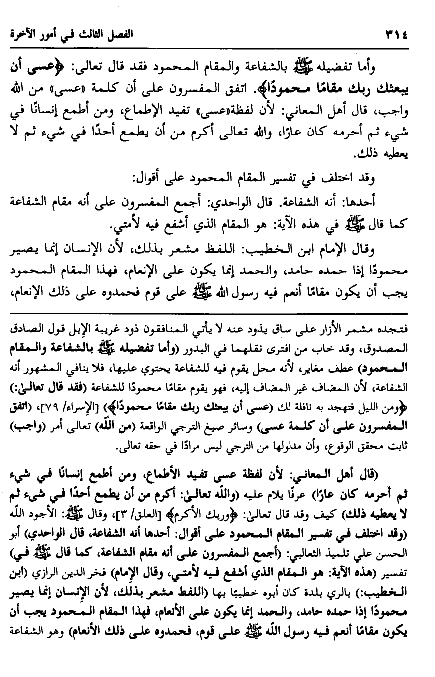 وأما تفضيله -صلى الله عليه وسلم- بالشفاعة والمقام المحمود, فقد قال تعالى: {عَسَى أَنْ يَبْعَثَكَ رَبُّكَ مَقَامًا مَحْمُودًا} اتفق المفسرون, على أن كلمة "عسى" من الله واجب، قال أهل المعاني: لأنَّ لفظة "عسى" تفيد الإطماع، ومن أطمع إنسانًا في شيء ثم أحرمه كان عارًا، والله تعالى أكرم من أن يطمع أحدًا في شيء ثم لا يعطيه ذلك.