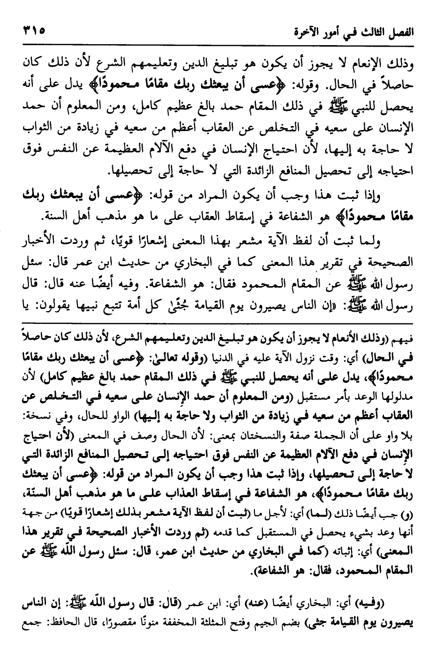فيهم, "وذلك الإنعام لا يجوز أن يكون هو تبليغ الدين وتعليمهم الشرع؛ لأن ذلك كان حاصلًا في الحال" أي: وقت نزول الآية عليه في الدنيا, "وقوله تعالى: {عَسَى أَنْ يَبْعَثَكَ رَبُّكَ مَقَامًا مَحْمُودًا} يدل على أنه يحصل للنبي -صلى الله عليه وسلم- في ذلك المقام حمد بالغ عظيم كامل"؛ لأن مدلولها الوعد بأمر مستقبل, "ومن المعلوم أن حمد الإنسان على سعيه في التخلص عن العقاب أعظم من سعيه في زيادة من الثواب, ولا حاجة به إليها" الواو للحال, وفي نسخة بلا واو, على أنَّ الجملة صفة, والنسختان بمعنًى؛ لأن الحال وصف في المعنى؛ "لأن احتياج الإنسان في دفع الآلام العظيمة عن النفس فوق احتياجه إلى تحصيل المنافع الزائدة التي لا حاجة إلى تحصيلها، وإذا ثبت هذا وجب أن يكون المراد من قوله: {عَسَى أَنْ يَبْعَثَكَ رَبُّكَ مَقَامًا مَحْمُودًا} هو الشفاعة في إسقاط العذاب على ما هو مذهب أهل السنة، و" جب أيضًا ذلك "لما" أي: لأجل ما ثبت أن لفظ الآية مشعر بذلك إشعارًا قويًّا" من جهة أنها وعد بشيء يحصل في المستقبل كما قدَّمه, "ثم وردت الأخبار الصحيحة في تقرير هذا المعنى" أي: إثباته "كما في البخاري من حديث ابن عمر، قال: سئل رسول الله -صلى الله عليه وسلم- عن المقام المحمود، فقال: "هو الشفاعة".