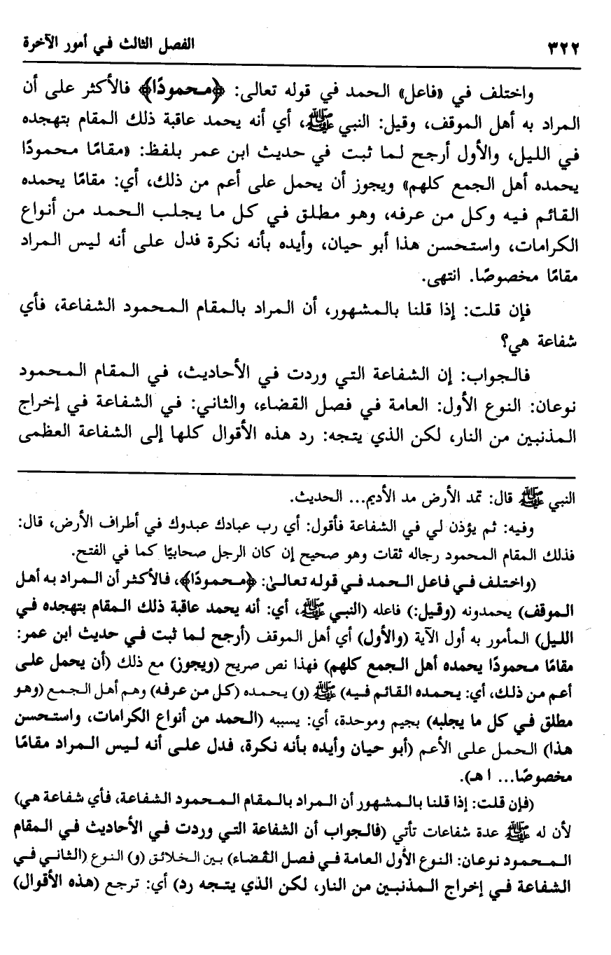"فإن قلت: إذا قلنا بالمشهور أنَّ المراد بالمقام المحمود والشفاعة, فأي شفاعة هي؟ " لأنَّ له -صلى الله عليه وسلم- عدة شفاعات تأتي, "فالجواب: إن الشفاعة التي وردت في الأحاديث في المقام المحمود نوعان: النوع الأول: العامَّة في فصل القضاء" بين الخلائق, "و" النوع الثاني: في الشفاعة في إخراج المذنبين من النار, لكن الذي يتَّجه ردّ" أي: ترجع هذا الأقوال".