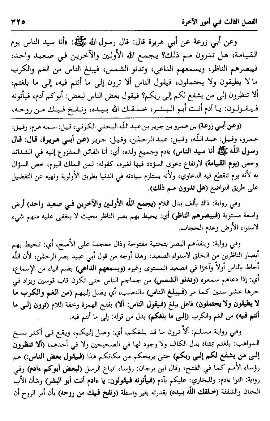 وعن أبي زرعة عن أبي هريرة قال: قال رسول الله -صلى الله عليه وسلم: "أنا سيد الناس يوم القيامة، هل تدرون مم ذلك؟ يجمع الله الأولين والآخرين في صعيد واحد، فيبصرهم الناظر، ويسمعهم الداعي، وتدنو الشمس، فيبلغ الناس من الغمِّ والكرب ما لا يطيقون ولا يحتملون, فيقول الناس: ألا ترون إلى ما أنتم فيه، إلى ما بلغتم، ألا تنظرون إلى مَنْ يشفع لكم إلى ربكم؟ فيقول بعض الناس لبعض: أبوكم آدم، فيأتونه فيقولون: يا آدم, أنت أبو البشر، خلقك الله بيده، ونفخ فيك من روحه،