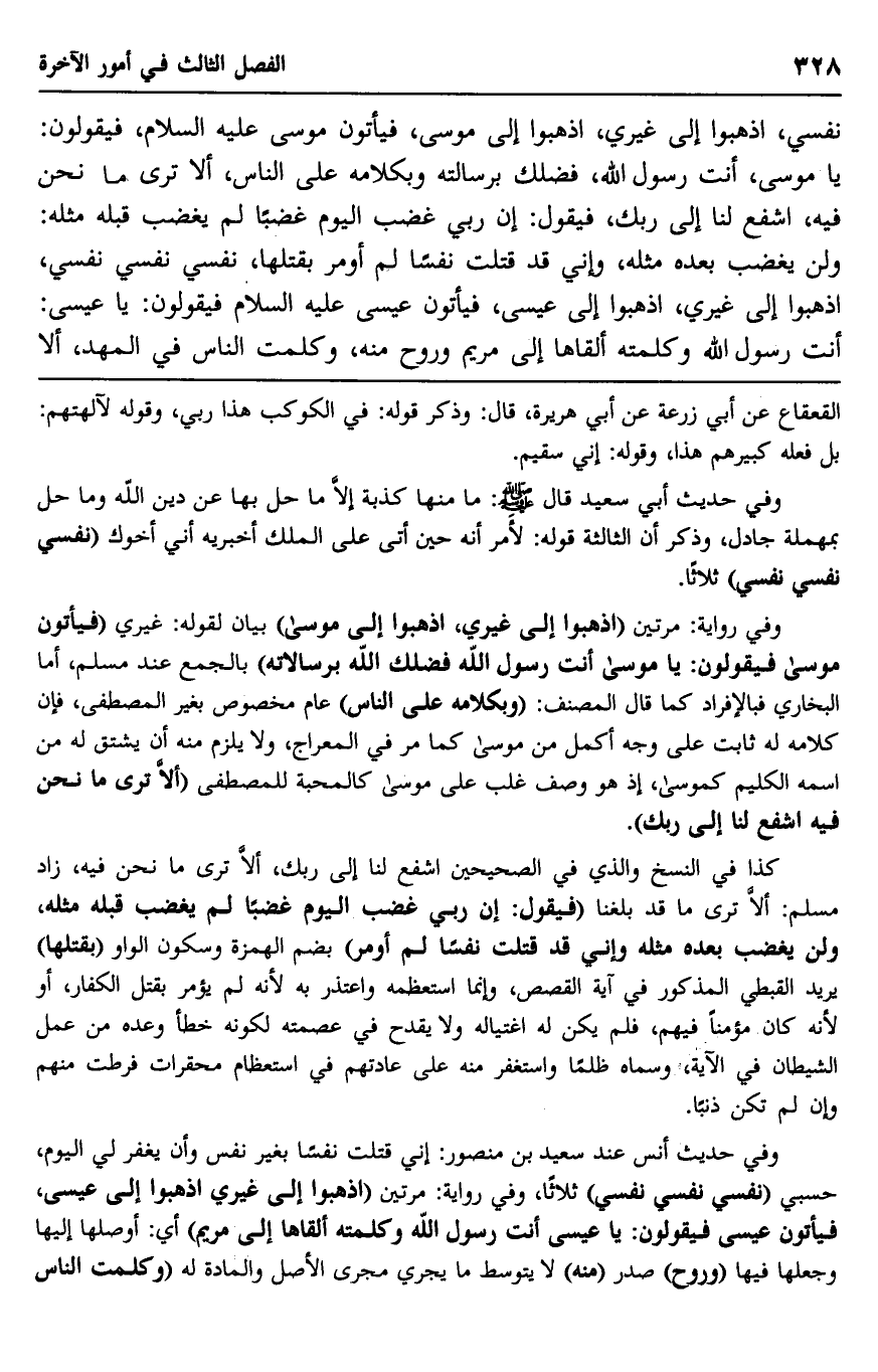 نفسي، اذهبوا إلى غيري، اذهبوا إلى موسى، فيأتون موسى -عليه السلام، فيقولون: يا موسى، أنت رسول الله، فضَّلك برسالته وبكلامه على الناس، ألا ترى ما نحن فيه، اشفع لنا إلى ربك، فيقول: إن ربي غضب اليوم غضبًا لم يغضب قبله مثله, ولن يغضب بعده مثله، وإني قد قتلت نفسًا لم أومر بقتلها، نفسي نفسي نفسي، اذهبوا إلى غيري، اذهبوا إلى عيسى، فيأتون عيسى -عليه السلام- فيقولون: يا عيسى: أنت رسول الله وكلمته ألقاها إلى مريم وروح منه، وكلَّمت الناس في المهد، ألا