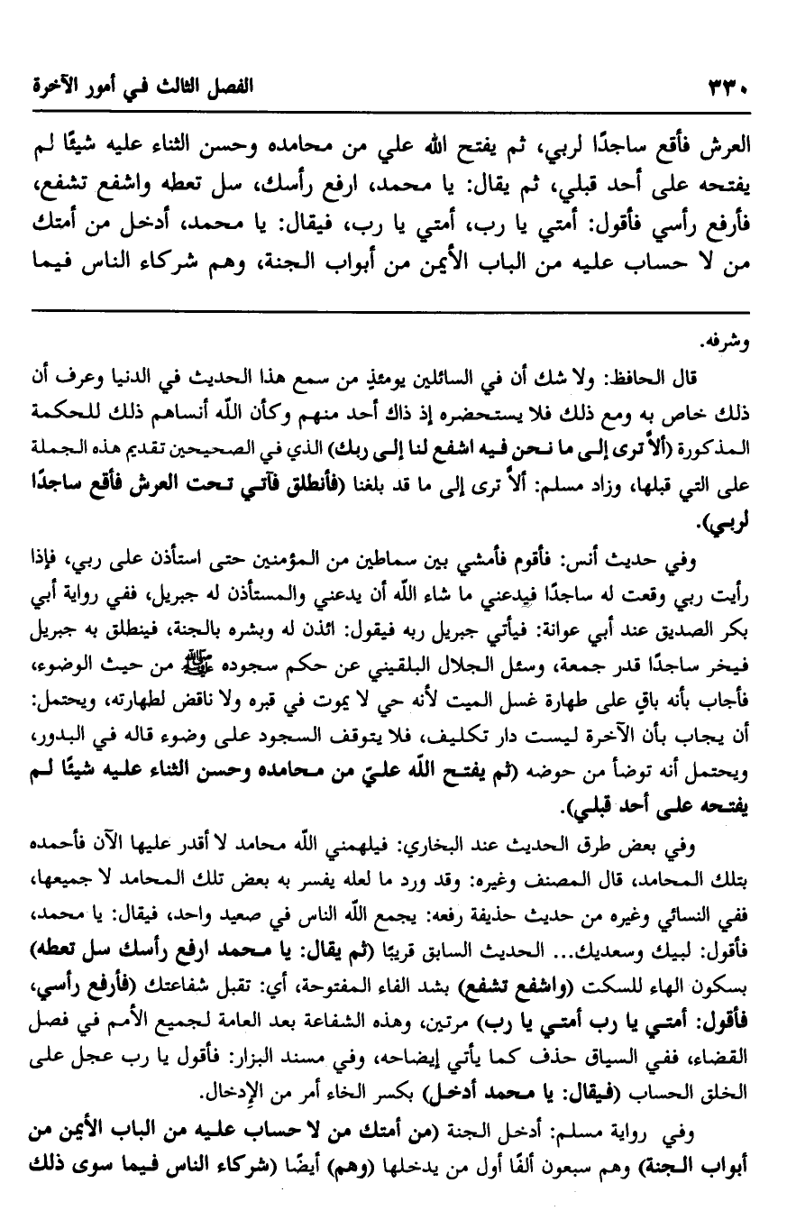 وفي بعض طرق الحديث عند البخاري: "فيلهمني الله محامد لا أقدر عليها الآن, فأحمده بتلك المحامد"، قال المصنّف وغيره: وقد ورد ما لعله يفسر به بعض تلك المحامد لا جميعها، ففي النسائي وغيره من حديث حذيفة رفعة: "يجمع الله الناس في صعيد واحد، فيقال: يا محمد، فأقول: لبيك وسعديك....." الحديث السابق قريبًا " ثم يقال: "يا محمد, ارفع رأسك, سل تعطه" بسكون الهاء للسكت, "واشفع تشفع" بشد الفاء المفتوحة، أي: تقبل شفاعتك, "فأرفع رأسي، فأقول: أمتي يا رب, أمتي يا رب" مرتين، وهذه الشفاعة بعد العامَّة لجميع الأمم في فصل القضاء، ففي السياق حذف كما يأتي إيضاحه، وفي مسند البزار: "فأقول: يا رب, عجّل على الخلق الحساب" , "فيقال: يا محمد, أدخل" بكسر الخاء أمر من الإدخال.