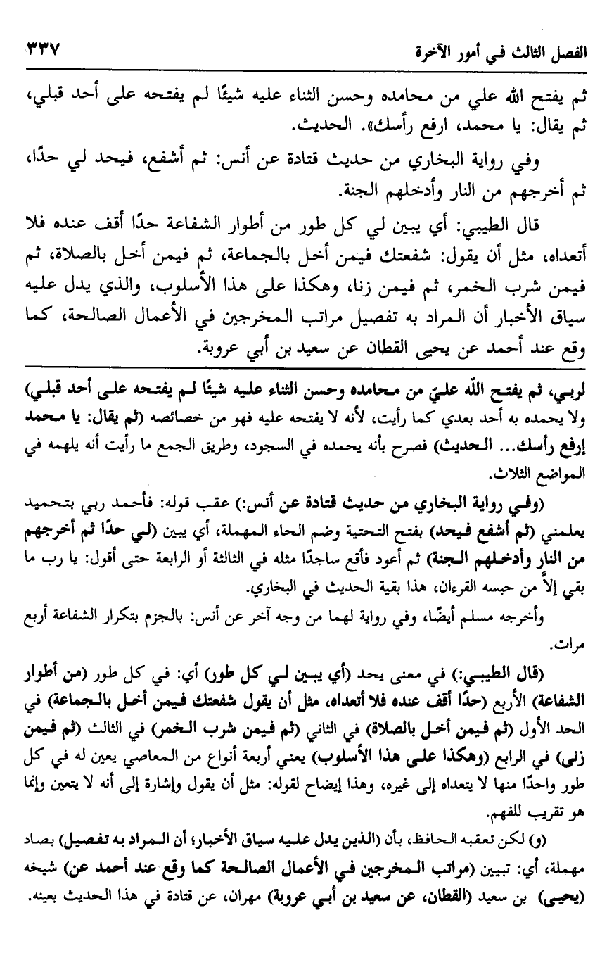 "وفي رواية البخاري من حديث قتادة عن أنس عقب قوله: "فأحمد ربي بتحميد يعلمني, ثم أشفع فيحِدّ" بفتح التحتية وضم الحاء المهملة، أي: يبين "لي حدًّا, ثم أخرجهم من النار وأدخلهم الجنة" , "ثم أعود فأقع ساجدًا مثله في الثالثة أو الرابعة حتى أقول: يا رب ما بقي إلّا من حبسه القرآن"، هذا بقية الحديث في البخاري.