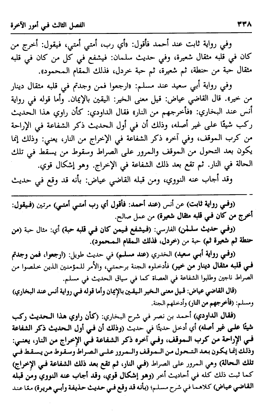 وفي رواية أبي سعيد عند مسلم: "ارجعوا فمن وجدتم في قلبه مثقال دينار من خير". قال القاضي عياض: قيل معنى الخير: اليقين بالإيمان، وأمَّا قوله في رواية أنس عند البخاري: "فأخرجهم من النار" فقال الداودي: كأنَّ راوي هذا الحديث ركب شيئًا على غير أصله, وذلك أنه في أول الحديث ذكر الشفاعة في الإراحة من كرب الموقف، وفي آخره ذكر الشفاعة في الإخراج من النار، يعني: وذلك إنما يكون بعد التحول من الموقف والمرور على الصراط وسقوط من يسقط في تلك الحالة في النار. ثم تقع بعد ذلك الشفاعة في الإخراج. وهو إشكال قوي.