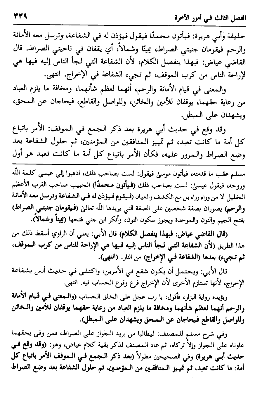 حذيفة وأبي هريرة: "فيأتون محمدًا فيقوم, فيؤذن له في الشفاعة، وترسل معه الأمانة والرحم, فيقومان جنبتي الصراط يمينًا وشمالًا"، أي: يقفان في ناحيتي الصراط. قال القاضي عياض: فبهذا ينفصل الكلام، لأنَّ الشفاعة التي لجأ الناس إليه فيها هي لإراحة الناس من كرب الموقف، ثم تجيء الشفاعة في الإخراج. انتهى.