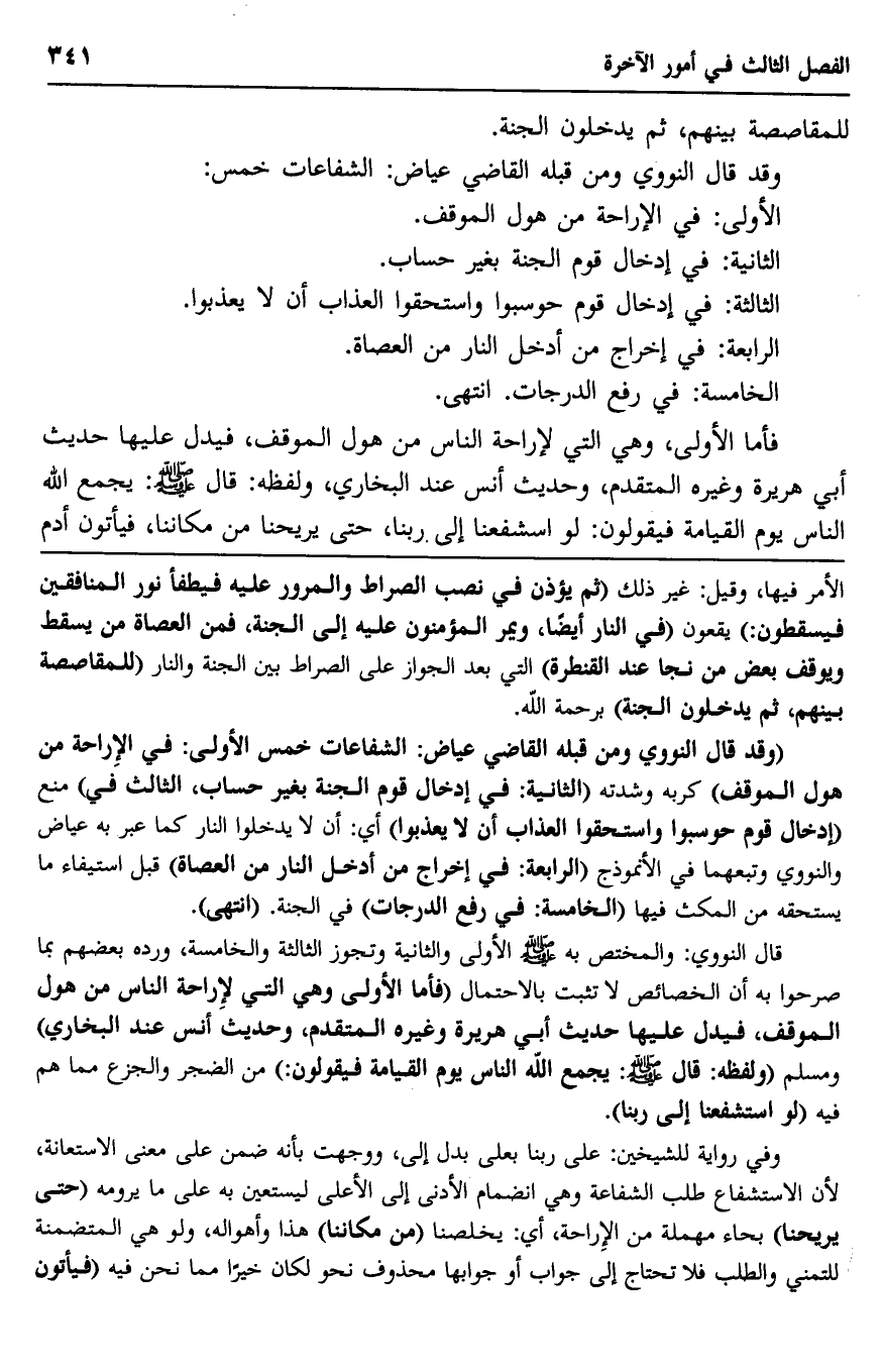 قال النووي: والختص به -صلى الله عليه وسلم- الأولى والثانية, وتجوز الثالثة والخامسة، وردَّه بعضهم بما صرَّحوا به أنَّ الخصائص لا تثبت بالاحتمال, "فأمَّا الأولى وهي التي لإراحة الناس من هول الموقف، فيدل عليها حيث أبي هريرة وغيره المتقدم، وحديث أنس عند البخاري" ومسلم, "ولفظه: قال -صلى الله عليه وسلم: "يجمع الله الناس يوم القيامة فيقولون" من الضجر والجزع مما هم فيه, "لو استشفعنا إلى ربنا".