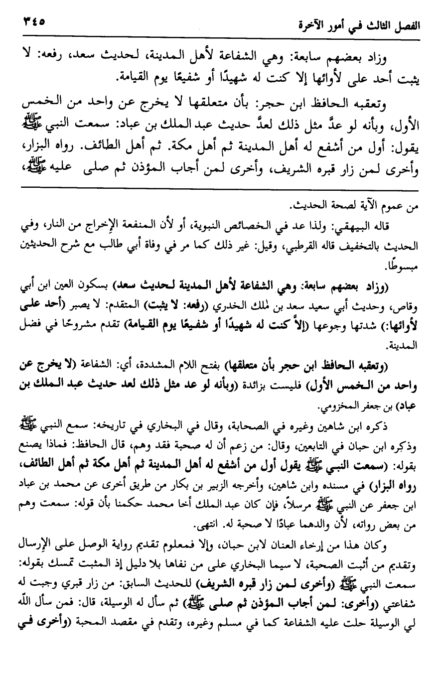 وتعقبه الحافظ ابن حجر: بأن متعلقها لا يخرج عن واحد من الخمس الأول، وبأنه لو عدَّ مثل ذلك لعد حديث عبد الملك بن عباد: سمعت النبي -صلى الله عليه وسلم- يقول: "أول من أشفع له أهل المدينة, ثم أهل مكة, ثم أهل الطائف". رواه البزار، وأخرى: لمن زار قبره الشريف، وأخرى: لمن أجاب المؤذن ثم صلى عليه -صلى الله عليه وسلم،