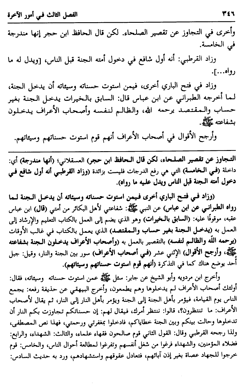 وزاد في فتح الباري أخرى: فيمَنْ استوت حسناته وسيئاته أن يدخل الجنة، لما أخرجه الطبراني، عن ابن عباس قال: السابق بالخيرات يدخل الجنة بغير حساب, والمقتصد يرحمه الله، والظالم لنفسه وأصحاب الأعراف يدخلون بشفاعته -صلى الله عليه وسلم.