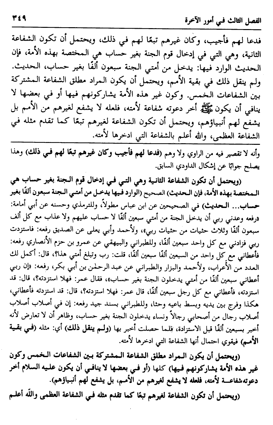 ويحتمل أن تكون الشفاعة الثانية, وهي التي في إدخال قوم الجنة بغير حساب هي المختصة بهذه الأمة, فإن الحديث الصحيح الوارد فيها: "يدخل من أمتي الجنة سبعون ألفًا بغير حساب...." الحديث في الصحيحين عن ابن عباس مطولًا، وللترمذي وحسَّنه عن أبي أمامة رفعه: "وعدني ربي أن يدخل الجنة من أمتي سبعين ألفًا لا حساب عليهم وا عذاب, مع كل ألف سبعون ألفًا, وثلاث حثيات من حثيات ربي" , ولأحمد وأبي يعلى عن الصديق رفعه: "فاستزدت ربي فزادني مع كل واحد سبعين ألفًا" , وللطبراني والبيهقي عن عمرو بن حزم الأنصاري رفعه: "فأعطاني مع كل واحد من السبعين ألفًا سبعين ألفًا، قلت: رب وتبلغ أمتي هذا؟ قال: أكمل لك العدد من الأعراب"، ولأحمد والبزار والطبراني عن عبد الرحمن بن أبي بكر رفعه: "إن ربي أعطاني سبعين ألفًا من أمتي يدخلون الجنة بغير حساب" فقال عمر: فهلّا استزدته؟ قال: "قد استزدته, فأعطاني ألفًا من أمتي يدخلون الجنة بغير حساب" فقال عمر: فهلّا استزدته؟ قال: "قد استزدته، فأعطاني مع كل رجل سبعين ألفًا"، قال عمر: فهلّا استزدته؟ قال: "قد استزدته, فأعطاني، هكذا وفرج بين يديه وبسط باعيه وحثا"، وللطبراني بسند جيد رفعه: "إن في أصلاب أصلاب أصلاب رجال من أصحابي رجالًا ونساء يدخلون الجنة بغير حساب"، وظاهر أن لا تعارض؛ لأنه أخبر سبعين ألفًا قبل الاستزادة, فلمَّا حصلت أخبر بها, ولم ينقل ذلك" أي: مثله "في بقية الأمم" فيقوى احتمال أنها الشفاعة التي ادَّخرها لأمته.