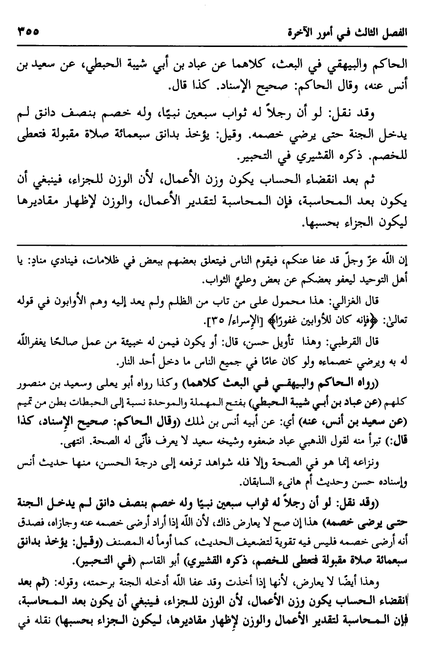 وقد نقل: لو أنَّ رجلًا له ثواب سبعين نبيًّا، وله خصم بنصف دانق, لم يدخل الجنَّة حتى يرْضى خصمه. وقيل: يؤخذ بدانق سبعمائة صلاة مقبولة فتعطى للخصم. ذكره القشيري في التحبير.