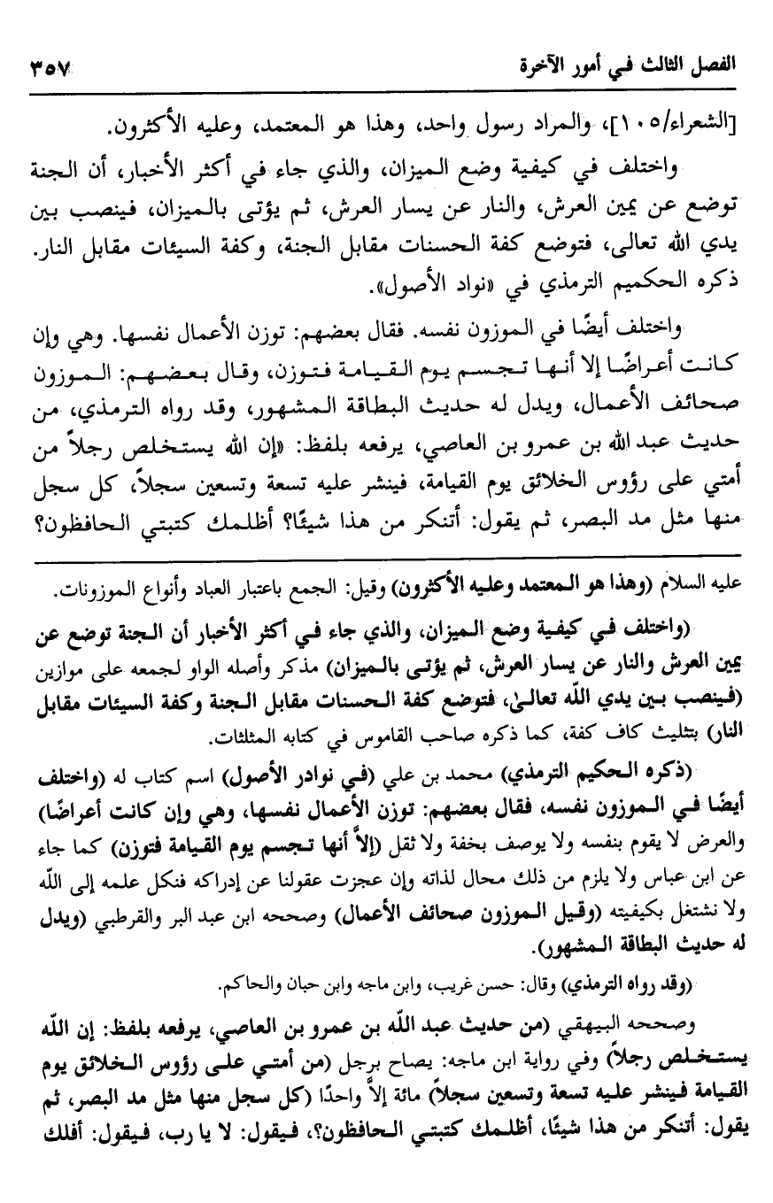 واختلف أيضًا في الموزون نفسه, فقال بعضهم: توزن الأعمال نفسها, وهي وإن كانت أعراضًا إلّا أنها تجسَّم يوم القيامة فتوزن، وقال بعضهم: الموزون صحائف الأعمال، ويدل له حديث البطاقة المشهرة، وقد رواه الترمذي، من حديث عبد الله بن عمرو بن العاص، يرفعه بلفظ: "إن الله يستخلص رجلًا من أمتي على رءوس الخلائق يوم القيامة، فينشر عليه تسعة وتسعين سجلًا، كل سجل منها مثل مد البصر، ثم يقول: أتنكر من هذا شيئًا؟ أظلمك كتبتي الحافظون؟