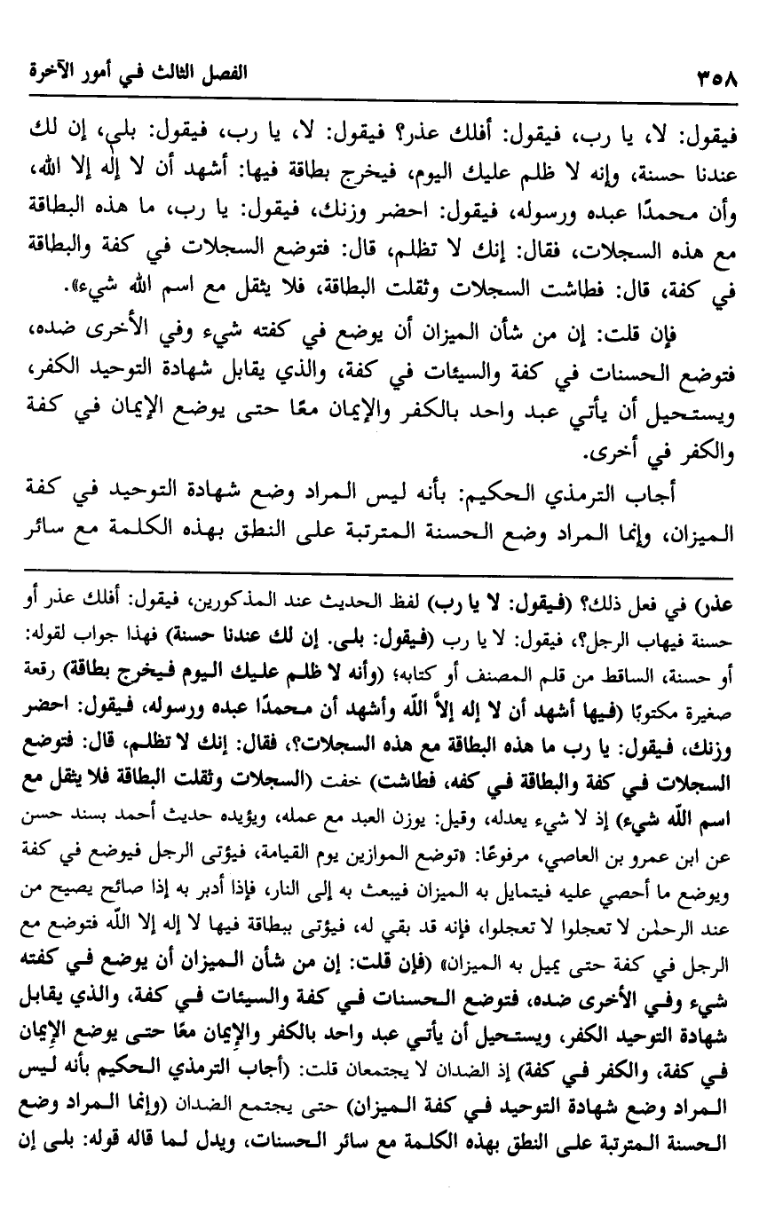 أجاب الترمذي الحكيم: بأنه ليس المراد وضع شهادة التوحيد في كفة الميزان، وإنما المراد وضع الحسنة المترتبة على النطق بهذه الكلمة مع سائر