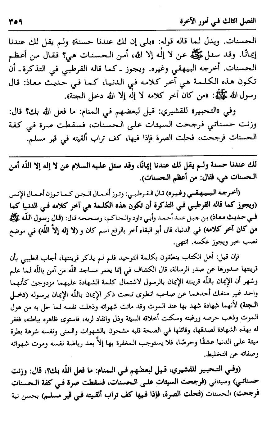 "وفي التحبير للقشيري، قيل لبعضهم في المنام: ما فعل الله بك؟ قال: وزنت حسناتي" وسيئاتي, "فرجحت السيئات على الحسنات، فسقطت صرة في كفة الحسنات, فرجحت" الحسنات, "فحلت الصرة، فإذا فيها كفّ تراب ألقيته في قبر مسلم" بحسن نية