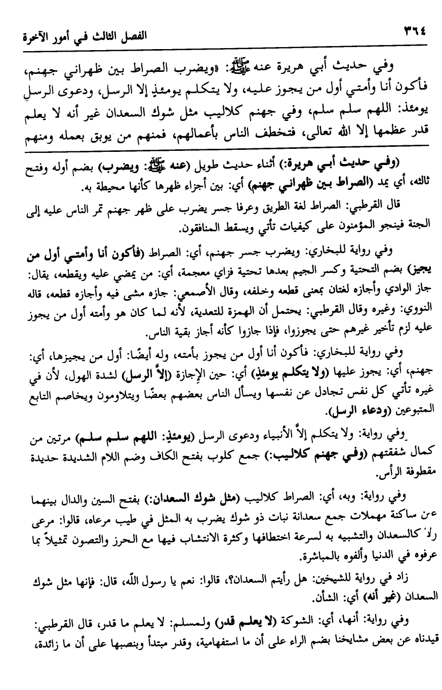 وفي حديث أبي هريرة عنه -صلى الله عليه وسلم: "ويضرب الصراط بين ظهراني جهنم، فأكون أنا وأمتي أوّل من يجوز عليه، ولا يتكلّم يومئذ إلّا الرسل، ودعوى الرسل يومئذ: اللهم سلّم سلّم، وفي جهنم كلاليب مثل شوك السعدان, غير أنه لا يعلم قدر عظمها إلّا الله تعالى، فتخطف الناس بأعمالهم، فمنهم من يوبق بعمله, ومنهم