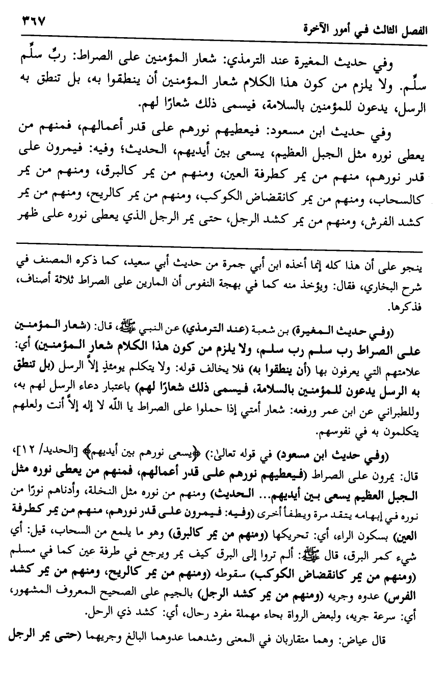 وفي حديث ابن مسعود: فيعطيهم نورهم على قدر أعمالهم، فمنهم من يعطى نوره مثل الجبل العظيم، يسعى بين أيديهم، الحديث، وفيه: فيمرون على قدر نورهم، منهم من يمر كطرفة العين، ومنهم من يمر كالبرق، ومنهم من يمر كالسحاب, ومنهم من يمر كانقضاض الكوكب، ومنهم من يمر كالريح، ومنهم من يمر كشد الفرس، ومنهم من يمر كشد الرجل, حتى يمر الرجل الذي يعطى نوره على ظهر