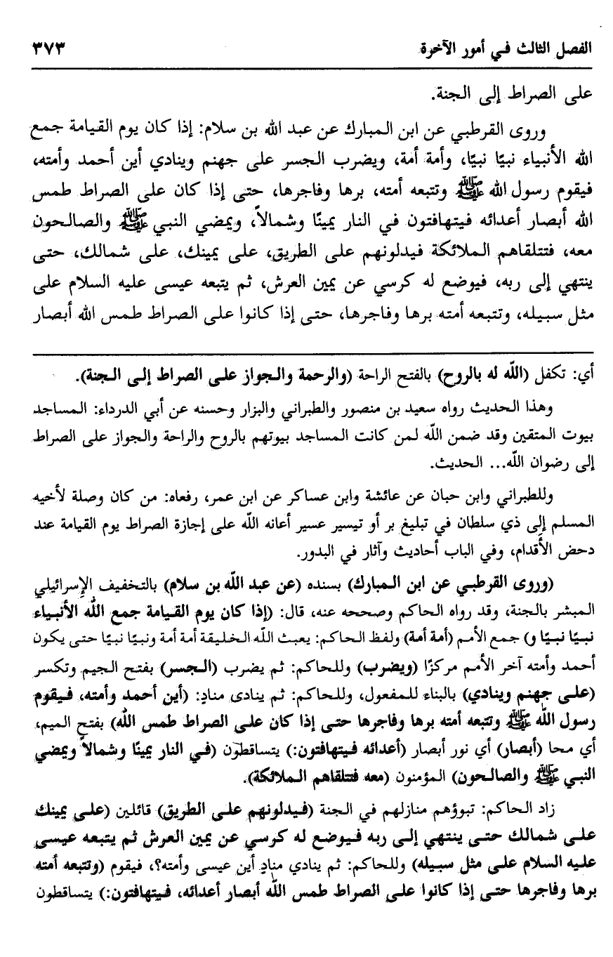 "وروى القرطبي عن ابن المبارك" بسنده "عن عبد الله بن سلام" بالتخفيف- الإسرائيلي المبشر بالجنة، وقد رواه الحاكم وصحَّحه عنه، قال: "إذا كان يوم القيامة جمع الله الأنبياء نبيًّا نبيًّا " جمع الأمم "أمة أمة" ولفظ الحاكم: "يبعث الله الخليفة أمَّة أمَّة ونبيًّا نبيًّا, حتى يكون أحمد وأمته آخر الأمم مركزًا" , "ويضرب" وللحاكم: ثم يضرب "الجسر" بفتح الجيم وتكسر- "على جهنم, وينادى" بالبناء للمفعول، وللحاكم: ثم ينادي مناد: "أين أحمد وأمته، فيقوم رسول الله -صلى الله عليه وسلم- وتتبعه أمته برها وفاجرها, حتى إذا كان على الصراط طمس الله" بفتح الميم، أي: محا "أبصار" أي: نور أبصار "أعدائه فيتهافتون" يتساقطون