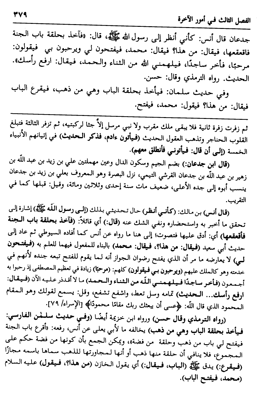جدعان: قال أنس: كأني أنظر إلى رسول الله -صلى الله عليه وسلم- قال: "فآخذ بحلقة باب الجنة فأقعقها، فيقال: من هذا؟ فيقال: محمد، فيفتحون لي, ويرحبون بي, فيقولون: مرحبًا، فآخِرّ ساجدًا, فيلهمني الله من الثناء والحمد، فيقال: ارفع رأسك". الحديث. رواه الترمذي وقال: حسن.